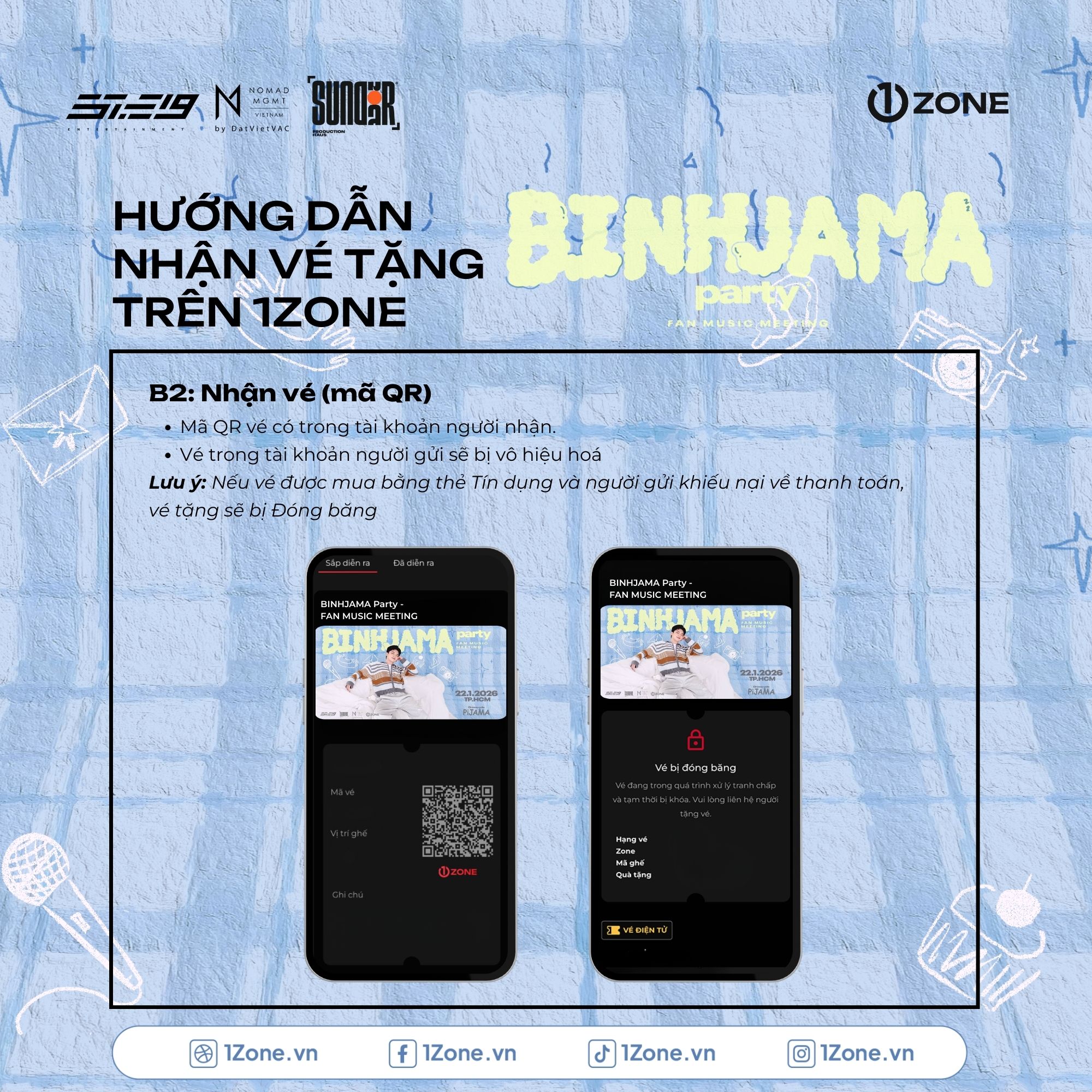 Vé bao gồm: Photo 1:1; After party with Vương Bình; MERCH Signed poster; 2 photocards; Thank you letter; 2 sticker sets; Keychain; Hộp kẹo dừa; FC Voi Con official member card; Bandana.